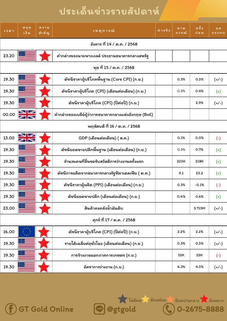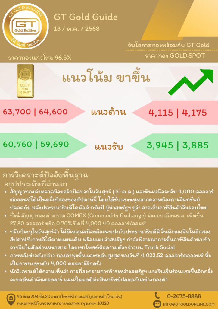 บทวิเคราะห์ทางเทคนิคราคาทอง 13 ตุลาคม 2568 BY:GT GOLD (สนใจเทรดทองคำแท่งออนไลน์ถูกต้องตามกฎหมาย 02-675-8888 กด 2ตุลาคม 13, 2025