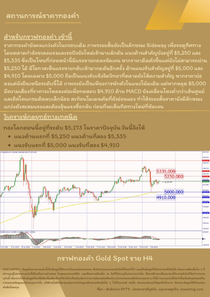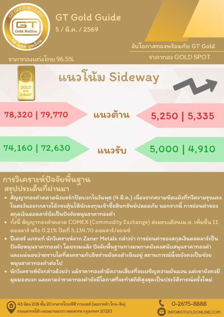 บทวิเคราะห์ทางเทคนิคราคาทอง 05 มีนาคม 2569 BY:GT GOLD (สนใจเทรดทองคำแท่งออนไลน์ถูกต้องตามกฎหมาย 02-675-8888 กด 2มีนาคม 5, 2026