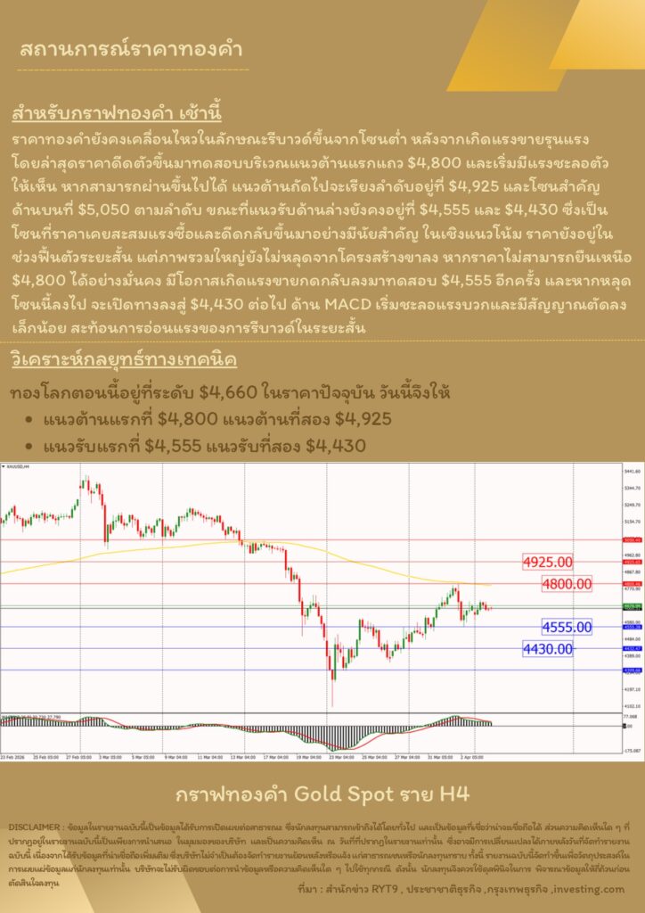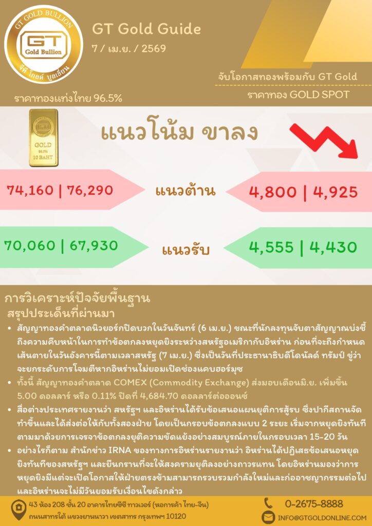 บทวิเคราะห์ทางเทคนิคราคาทอง 07 เมษายน 2569 BY:GT GOLD (สนใจเทรดทองคำแท่งออนไลน์ถูกต้องตามกฎหมาย 02-675-8888 กด 2เมษายน 7, 2026