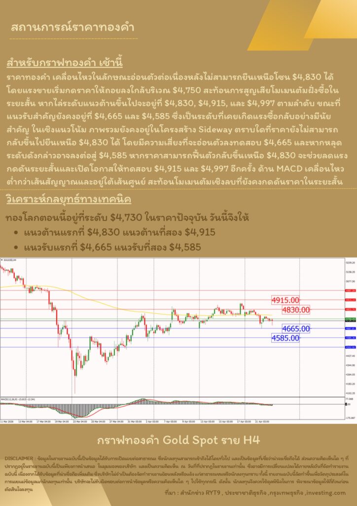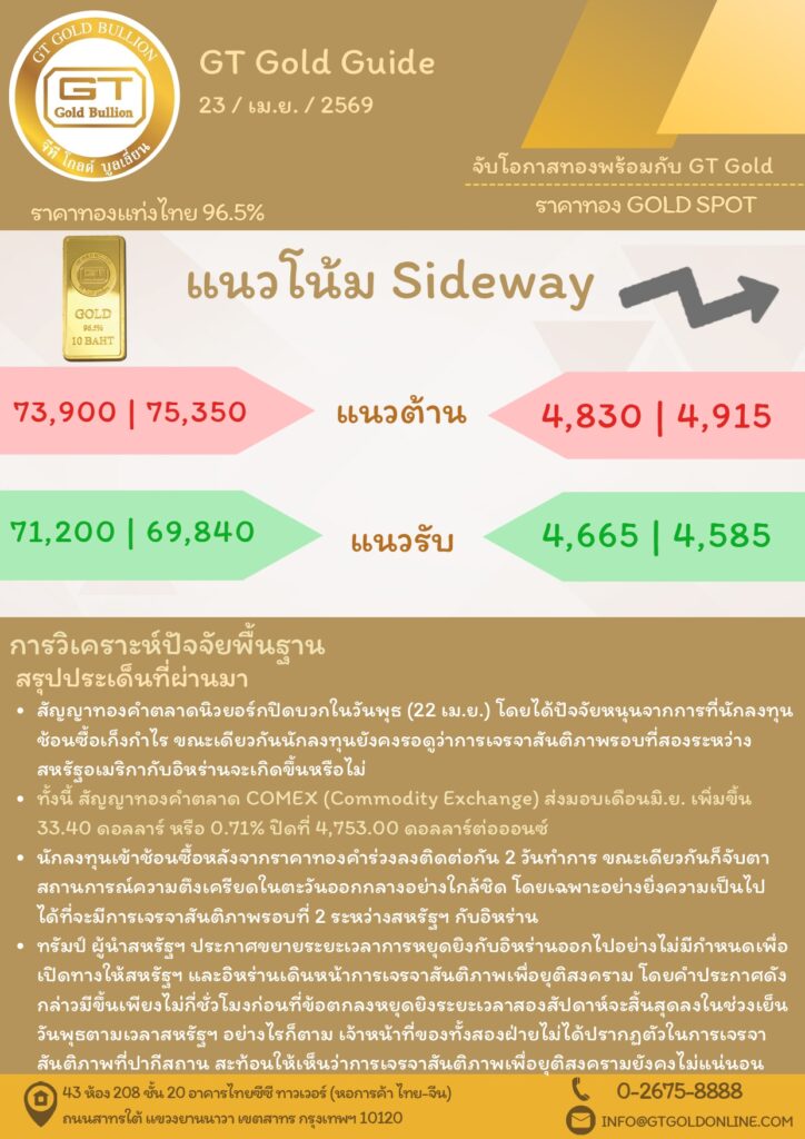 บทวิเคราะห์ทางเทคนิคราคาทอง 23 เมษายน 2569 BY:GT GOLD (สนใจเทรดทองคำแท่งออนไลน์ถูกต้องตามกฎหมาย 02-675-8888 กด 2เมษายน 23, 2026